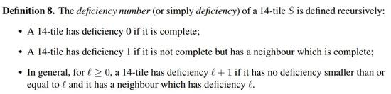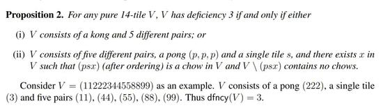 定义牌面的组合后,我们需要一种度量方法以确定到底当前 14 张牌离胡牌还有多远,这里作者引入了缺牌数(deficiency)。简单而言,缺牌数表示的就是当前牌面到胡牌还差多少张牌。