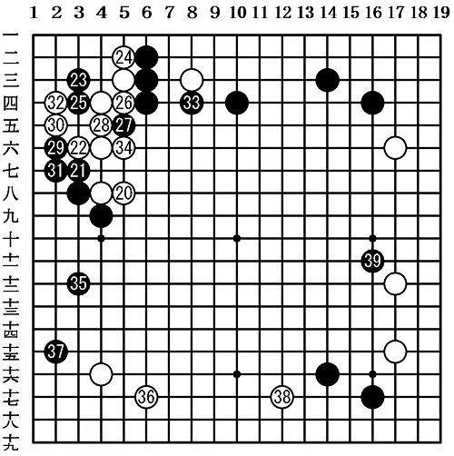 村川大介黑23选择点三三,希望抢走白棋的根据地,战术相当严厉。但是左上角一役之后意外地和平收场。黑33和黑35这两手棋,看上去在上方和左边都有点效果,但是很难直接进行评价。