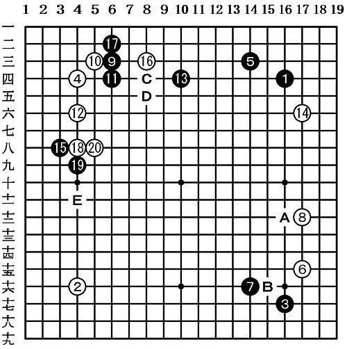 很久以前的大恶手,白10已经深入民心。而实战例也相当丰富。白16的打入让局面生动起来。对铃木伸二来说希望黑棋在C位压一手。这样白棋就有在17位选择扳粘补角的手段。实战黑17之后,白下出了白18和白20,这样铃木伸二将白D和E作为见合。