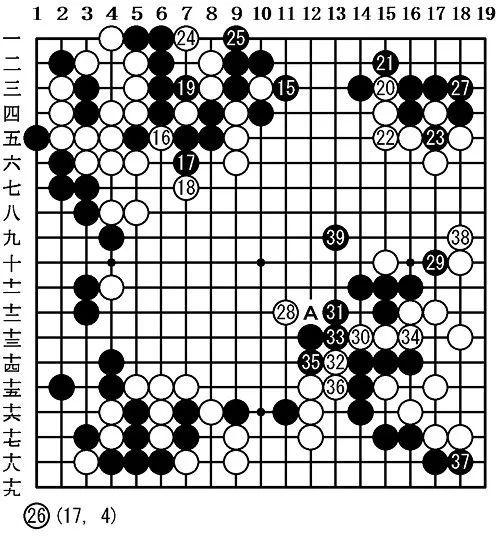 对铃木伸二来说,白28紧逼,将全部希望寄托于右下角的黑棋。但是此时黑棋已经没有其他薄棋,只要集中精力处理右下角即可。对职业棋手来说可以轻轻松松解决问题。很多人都会觉得黑A是好手,瞄着整体的安全,然后悠然自得地跑出。