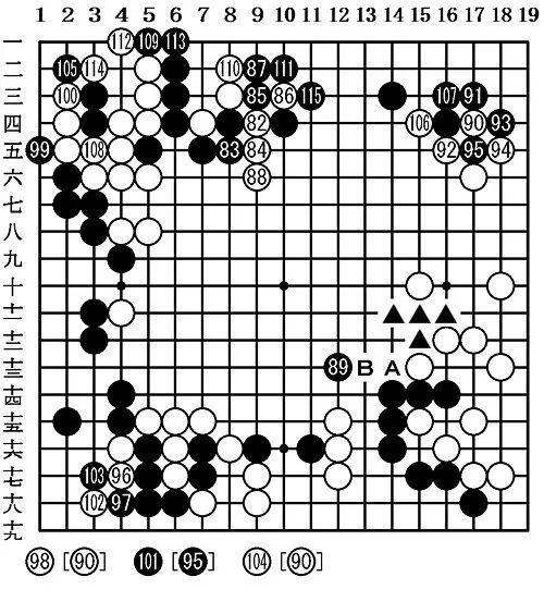 行至白88是一本道,黑89这手棋觉得自己的形势还并不差。如果觉得劣势的话黑棋有可能在黑115位抱吃先捞目,如果白A的话,黑B开始有可能会考虑弃掉▲四子。