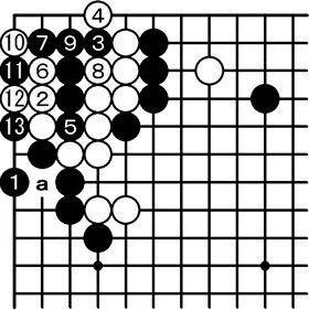 如果下在黑1的话,角上还有一点余味。白2之后黑3和黑5的断成立。行至黑13形成劫争。实战黑1在a位所以角上全部变成了白棋。如果白2在黑5位粘上的话,黑3的尖顶和白2位的挤都是先手,角上依旧有手段。