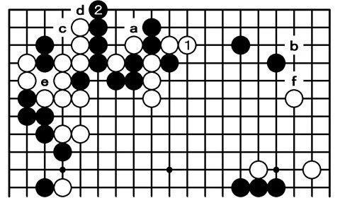 我们回到前面的问题上。白90这手棋研究室表示白1比较好。如果黑a的话白b点三三,黑棋就很难形成和实战一样的实空,这样明显是白棋不错。但是双方很快就指出了黑2的手段。因为有黑c,白d,黑e的手段,所以白只能选择d位。这样一来只要黑f和右上角保住的话,依旧是黑棋的优势局面。