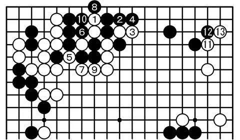 当然了,上图的白1下在白3也相当有利,黑2下在1位的话,白12位开始掏角也是白好的局面。但是此时黑棋有更好的手段,答案在稍后揭晓。