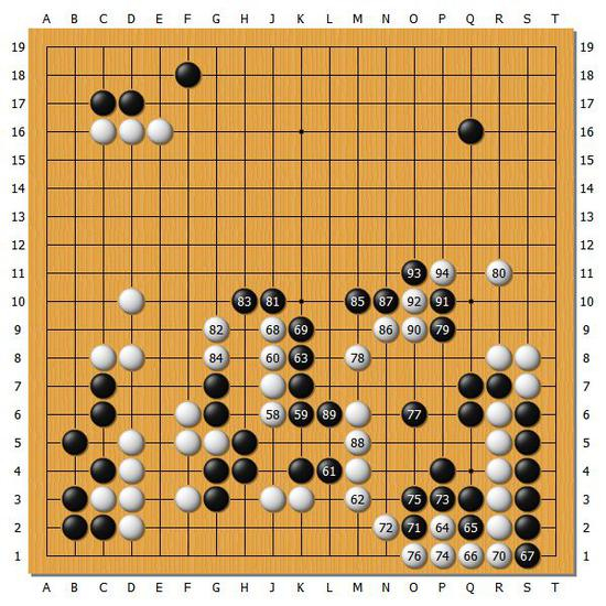 井山:中央在封锁白棋的时候吧,前面还是相当复杂的。然后中央的战斗之后依旧是一场场激战。形势一直都是扑朔迷离的状态。最后在左边活得很大之后,才意识到这盘棋形势终于转好了。