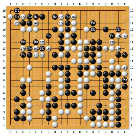 【图11】白178的胜负手面前,黑棋也冷静应对,黑185虎之后黑棋已经确立了胜势。