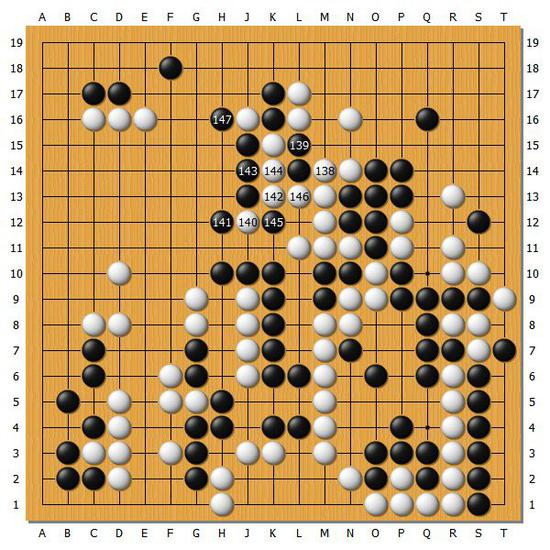 【图9】总结果来看,白142或许是败招。黑143相当冷静,黑棋就这样全部连上了。