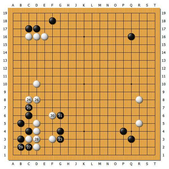 【图2】行至黑31告一段落,下到这里感觉是黑棋稍好的样子。