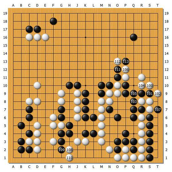 【图7】实战白108和白110不得不选择补活,而黑111和黑113相当强势,黑棋进入了优势局面。或许白100的小尖在白104位夹一手会比较好。