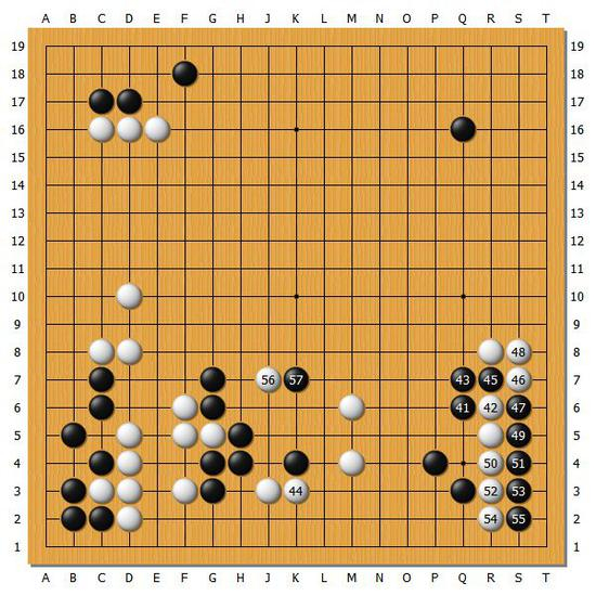 【图4】黑47的强劲手段,很符合井山裕太追究最强手段的棋风。而白56的进攻面前,黑57的反击也非常精彩。