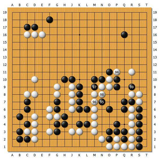 【图6】但是白94可以说是本局的转折点,实战黑95到黑99吃掉白棋3子之后,白棋还需要花费力气在下方补活。本局也就此进入了黑棋的节奏。