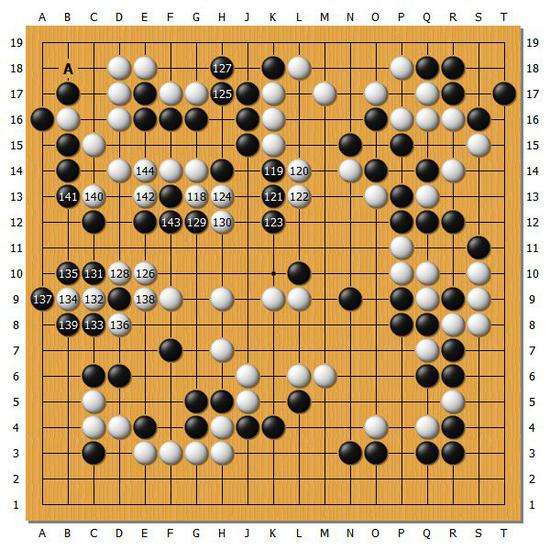 【图7】不过白棋为了留住劫争,选择在白144团确实相当痛苦。或许此时在A位夹的话会稍微舒服一些。