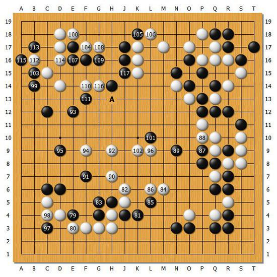 【图6】黑117实战贴了一手,不过此时在A位长出来的话,黑棋可能要稍厚一些。