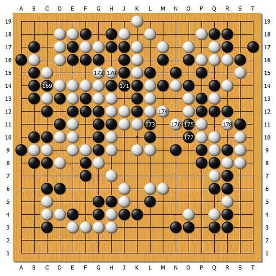 【图10】白176和白178也是好手,白棋在吃掉上方之后,再顺利活出右边的白棋,此时黑棋的逆转已经不可能了。