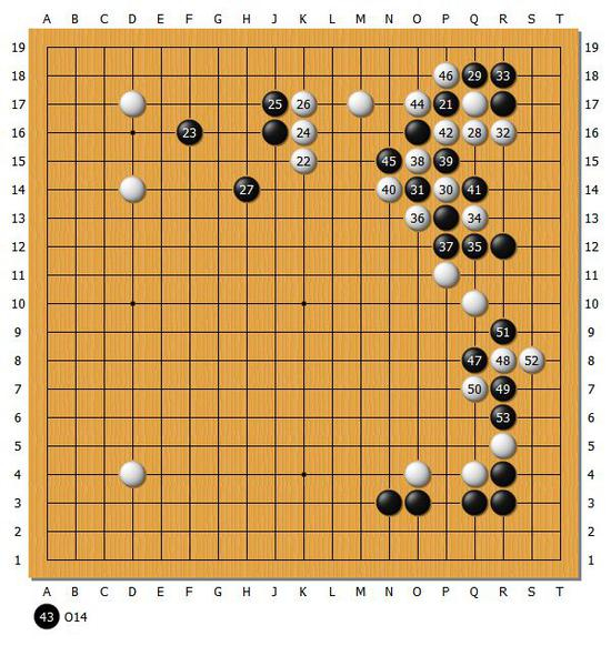 【图2】黑51打之后黑53的顶是手筋,右下角黑棋的处理还是相当不错。