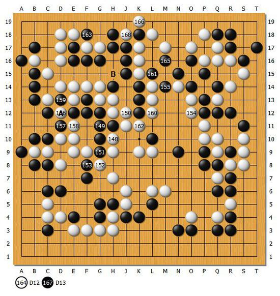【图9】最终白168拔掉一子,A和B形成见合之后,白棋胜势已定。