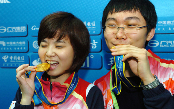 ▲ 2010年,在广州亚运会中李瑟娥五段与比她小两岁的朴廷桓九段拿下混双冠军。这两位棋手在女团和男团中也拿到冠军,是目前在韩国享受洲际大赛冠军待遇的全部两名职业棋手中的两人。