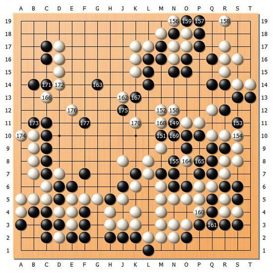 【图8】于是黑棋选择对上方的白棋进行消空。黑棋虽然很薄,但是黑177依旧非常强硬。