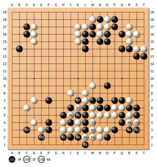 【图5】在激烈的劫争过后,双方在下方形成了转换。第一感直觉是白棋稍好的样子,但是黑棋的实空也很多,准备在后半盘发力。