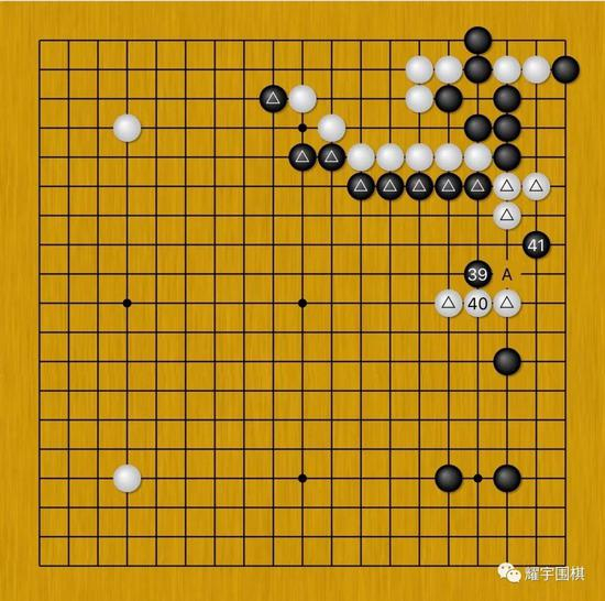 图6:果然,柯洁亮出了组合拳:黑39先刺,待白40粘上后,黑41二路点。