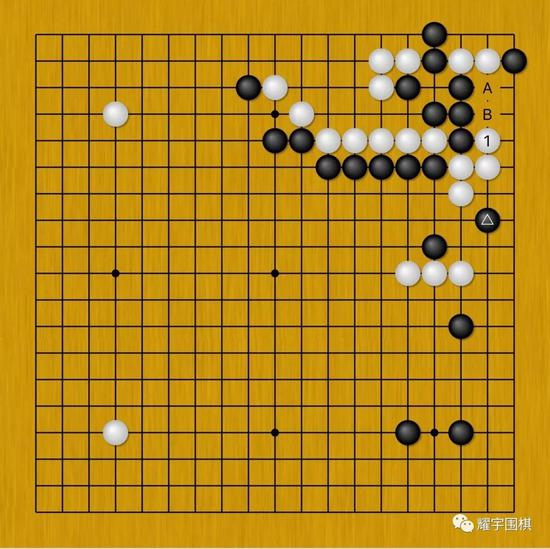 黑若是应在A位,那白棋的气得到延长,就可直接强硬对付黑三角二路点这颗子;黑若是应在B位紧住白气,那黑角就留下一个要命的定时炸弹(缓一气劫)。有了这个定时炸弹,白棋再像实战那样简单处理,白右边大块将游刃有余的多。
