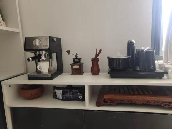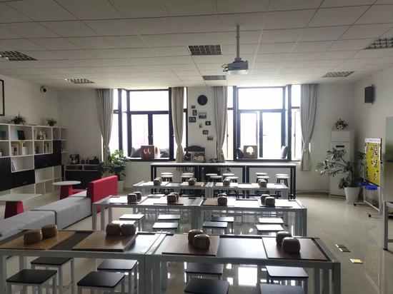 “围棋天地”旁边是相对而立的红与灰色调沙发,对应白色圆盘桌,其底座也是红色调,供同学们日常学习使用。新教室配置全面,内有教学投影机、空调、饮水机等设施,甚至配有咖啡机以及茶具。同学们在休息之余,可以和同伴们一同泡一杯咖啡,共度美好下午。