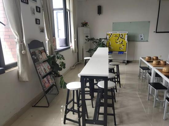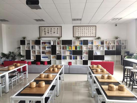 同学们可以选择在位于教室的左侧的休闲区进行阅读,而在休闲区最为夺人眼球的便是靠墙面的一排书柜。黑白相间的色彩元素,高度契合了围棋中“黑白相融”的理念。近看书柜,只见里面摆放着关于围棋知识的书籍。