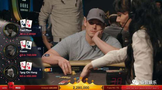 他在Day1的时候是场上的筹码领先者,面对Steve O‘Dwyer的一个抓鸡惊艳全场。在Day2时候筹码量起起伏伏,一直到最后11人时拿到一手AA,面对GPI第一Alex Foxen的“KK“和Paul Phua的AK,成功triple up,从而顺利进入到FT和决赛日的比赛。