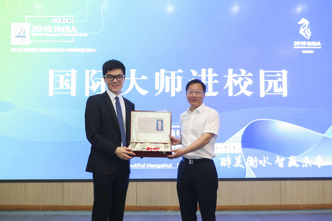 河北衡水中学党委书记、校长郗会锁向柯洁赠送纪念礼物