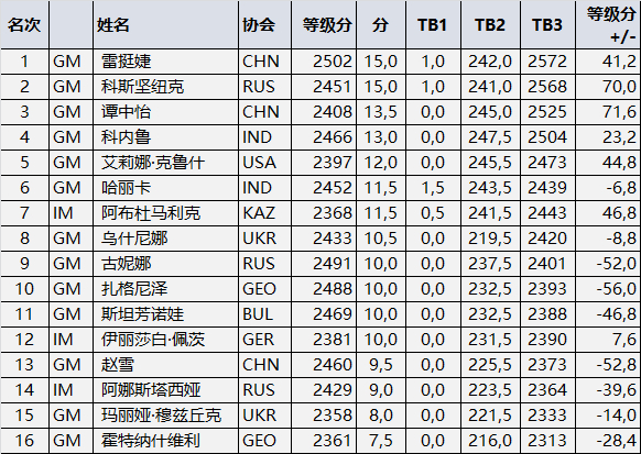 女子组的冠军争夺战斗到了最后一刻,在后半程比赛中俄罗斯棋手科斯坚纽克、古尼娜等轮流领跑,中国棋手谭中怡和雷挺婕一直位列中上游。