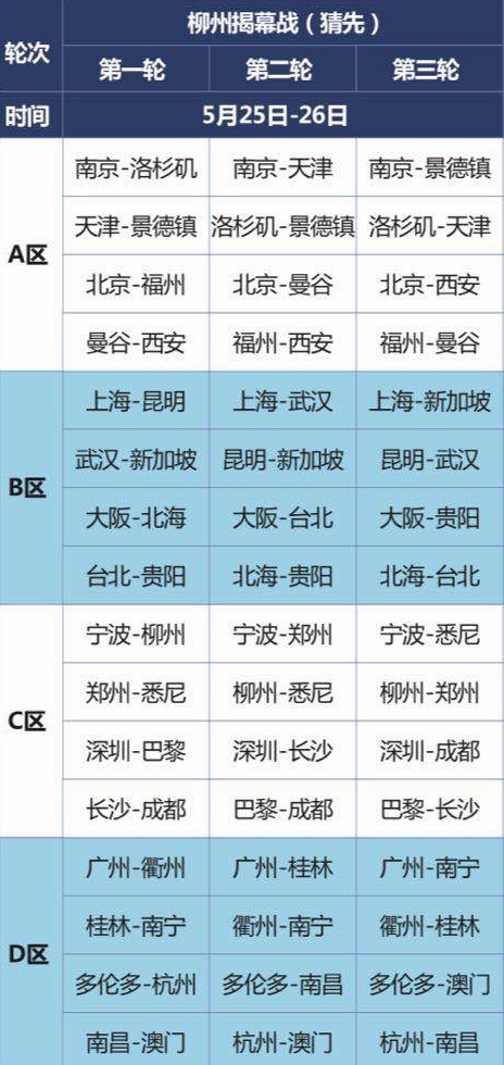 常规赛第1轮补赛将于5月25日下午19:30时进行,26日上午9时将进行常规赛第3轮。