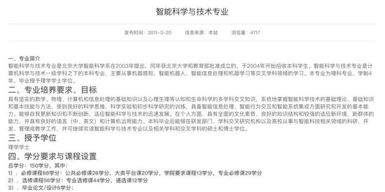 北大官网介绍,智能科学与技术专业是计算机科学与技术一级学科之下的本科专业,主要从事机器感知、智能机器人、智能信息处理和机器学习等交叉学科领域的学习。本专业为理科专业,学制4年,毕业授予理学学士学位。