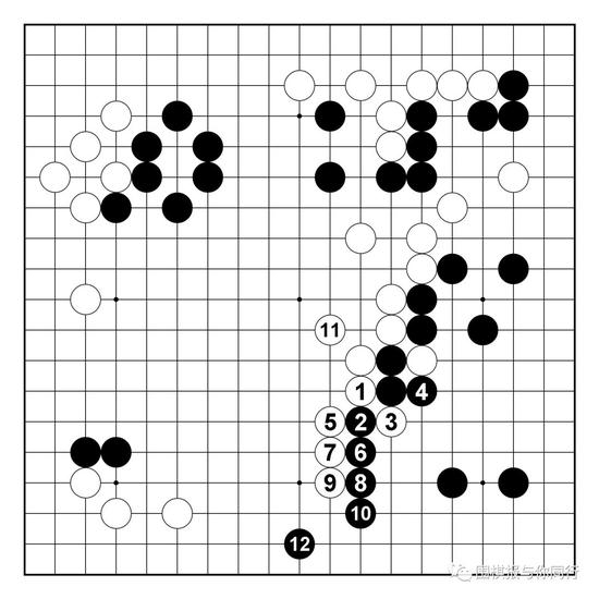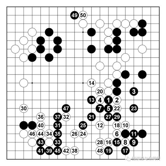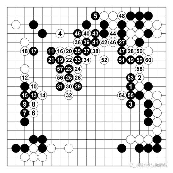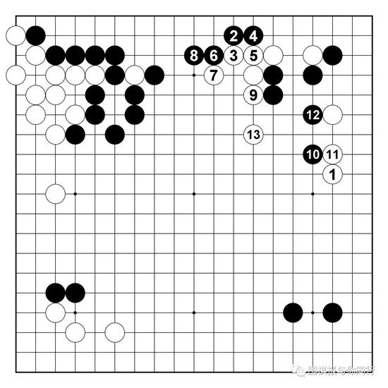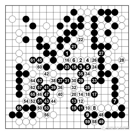 黑局部无论怎么应,都会被白棋便宜,所以57拐出必然,此后进程大致如此。白棋下方成功渡过,而黑棋吃通两子连厚,为之后对白棋上方和中间的搜刮手段做准备工作。
