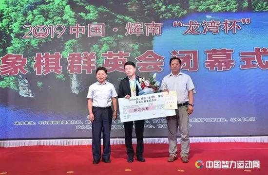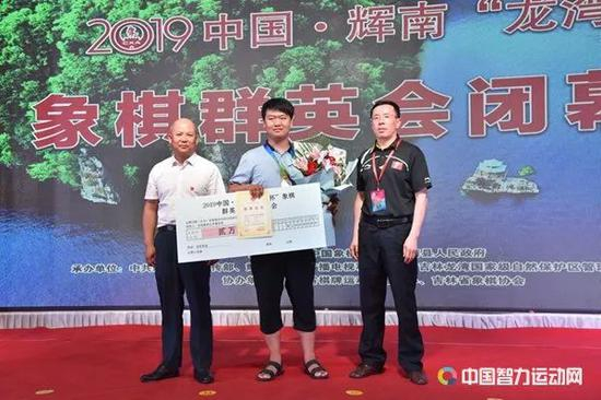 中国象棋协会品牌赛事开发委员会主任顾健,辉南县政协主席兰守堂为精英赛亚军洪智颁奖