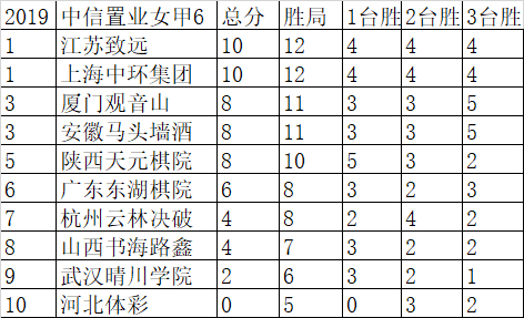 6轮比赛过后,江苏致远队与上海中环集团同积10分领跑积分榜;厦门观音山、安徽马头墙酒同积8分位居三、四位;陕西天元棋院队5分位居第五;广东东湖棋院积6分;杭州云林决破、山西书海路鑫积4分,武汉晴川学院2分,河北体彩0分。