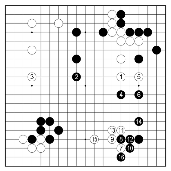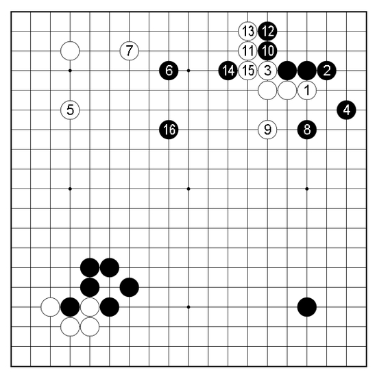 白1与黑2竟相出头后,白棋再抢一手,黑棋得以4位镇头迎击,进行到黑16为止,开局左上角的亏损逐步弥补不少。