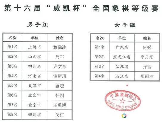 7月18日上午,第十六届“威凯杯”全国象棋等级赛经过五天激战在中国棋院落下帷幕,上海蒋融冰、广东何媛分别获得男子组和女子组冠军,并获得了申报象棋国家大师(运动健将)的资格。