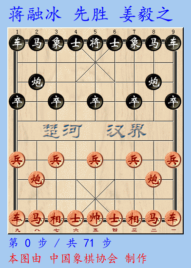 男子组蒋融冰和周军同以17分进入最后一轮,由于其他棋手最高只有15分,冠军基本在蒋融冰和周军之间产生。第一台蒋融冰先手迎战山东姜毅之,蒋融冰持续采取了前日夜里三分钟速杀河南猛将谢新琦的中炮盘头马进中兵凶悍战法,姜毅之似乎没有研究,布局吃亏甚大。蒋融冰抓住机会,先是借势占位,让黑棋疲于奔命,待得黑方守得没了章法,红开始连续扫卒,物质优势明显。至末盘,红已多三兵,蒋融冰鸣金收兵,兑换大子后,车四兵仕相全对车卒单缺象迅速拿下。