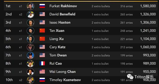 俄罗斯短牌高手Furkat领跑Day1,而中国玩家谈轩和徐亮则保持了他们在无限注德州主赛事的火热状态,暂列第4和第5名。2.5万英镑买入短牌冠军David Benefield没有选择休息,在夺冠后马上就投入了本场比赛,目前排名第二;超级碗冠军Isaac Haxton排名第3。