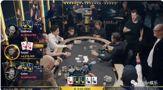 Daniel Cates在CO位选择用A3进行全下,Stephen Chidwick在小盲位用A7再次全下,这时Michael Soyza拿到了AQ同时他的筹码量cover另外两名选手,选择了跟注。