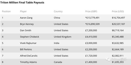 2。这是中国玩家第一次在Triton超高额豪客巡回赛的赛场上获得冠军头衔