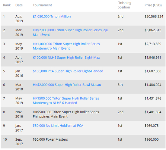 在Kenney过去13年的职业生涯里,其中有7年每年的奖金都超过120万美金,他总共赢得过七个7位数的奖金,和一个8位数的奖金,打进了178项赛事的钱圈,其中有65项所得奖金超过了10万美金,同时他还拥有一条WSOP金手链,让我们向这位当今世界扑克第一人致敬吧!顺便来看下,全球玩家奖金排行榜的前十位:
