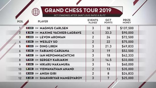棋王卡尔森尽管本站表现不佳,但仍以38分独领群雄。丁立人暂积21.3分排名第五位。