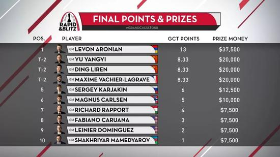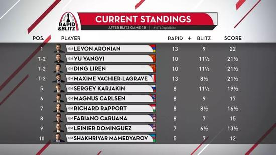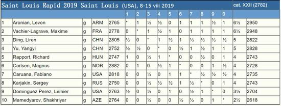 值得一提的是,本站比赛过后,卡尔森在快棋等级分和超快棋等级分上,均失去了世界排名第一的位置。瓦谢尔取代卡尔森,登上快棋等级分榜首位。没有参加本站比赛的美国棋手中村光则坐收渔利,升至超快棋等级分榜首位。两位中国棋手丁立人和余泱漪本站快棋和超快棋等级分都有大幅“盈利”,均排名世界前十。