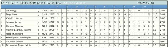 圣路易斯“快棋+超快棋”大战是2019超巡赛的第四站比赛。十位参赛棋手如上所示。十名棋手中,有六位世界排名前十(★等级分世界前100名-2019年8月)。余泱漪、多明格斯和拉波尔特均凭借分站赛外卡亮相。