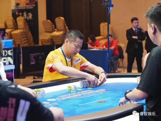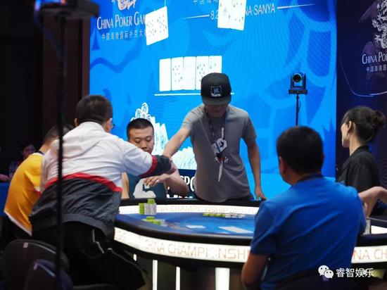 在蔡勇健离场后,陈乐名成为场上记分牌排名的第七名,他在其他玩家弃牌到小盲位置的时候选择全下20bb,但是令全场震惊的是,大盲位玩家沈先超后手筹码量为30bb左右选择了跟注!