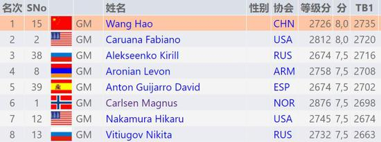 其他名次中,世界亚军美国棋手卡鲁阿纳与王皓同积8分,因小分稍低获得亚军。俄罗斯新秀阿列克谢延科、亚美尼亚棋手阿罗尼扬、西班牙棋手安东-奎亚罗、世界棋王挪威棋手卡尔森、美国棋手中村光和俄罗斯棋手维秋戈夫同积7.5分,分列第3-8名。