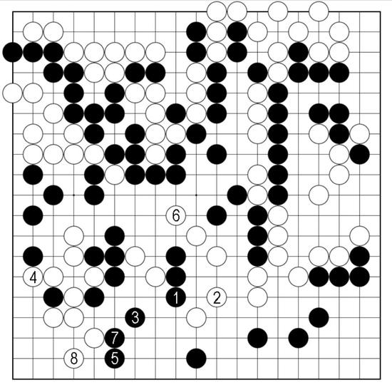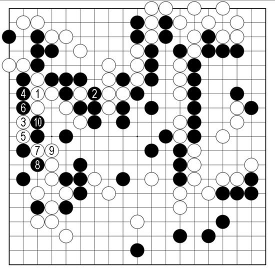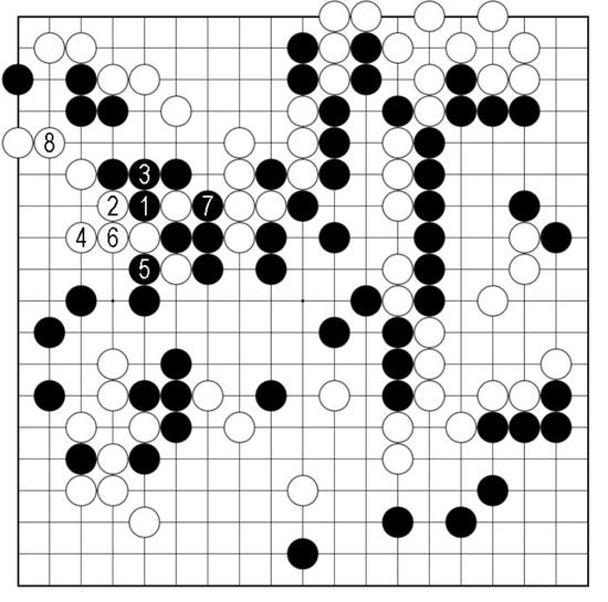 白2打黑3粘,白4再虎出眼形,是双方的“一本道”。接下来黑5打后再从7位提,白8立好手,白左边渡过与做眼已呈见合。如此应对,白乐见便宜。