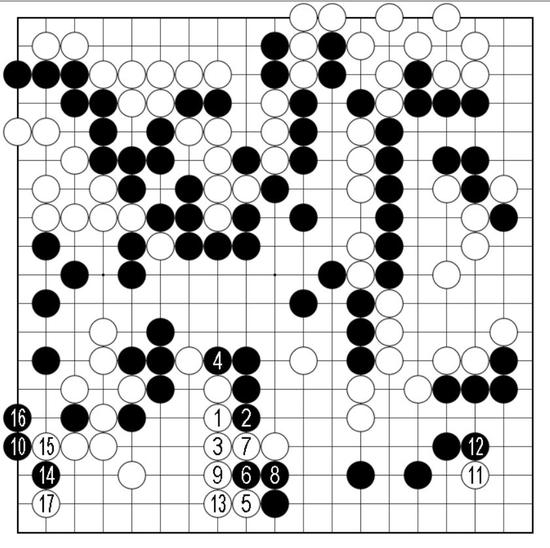黑2冲白3再退后,黑4在上方拐住后,白5再紧凑靠下。接下来黑10大升腿价值不小,白脱先于13位粘,进行至白17夹的收束,请读者细细品味。