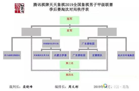 这样,2019全国象棋男子甲级联赛的四强就此浮出水面,分别是:四川龙翔通讯队、杭州环境集团队、广东碧桂园队以及河南楚河汉界天伦队。11月2日半决赛对阵:四川对河南、杭州对广东。
